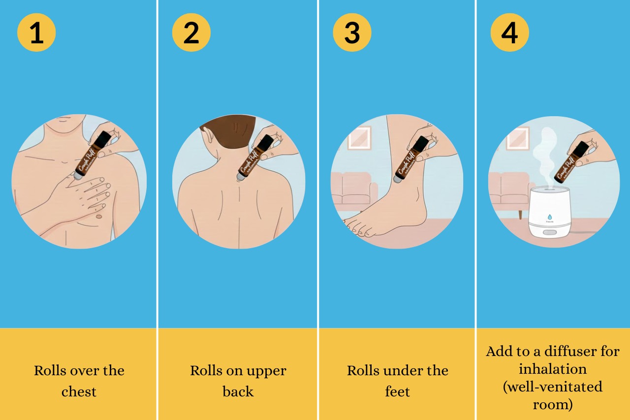 Apply a small amount to the chest or upper back, or use in a diffuser in a well-ventilated room.